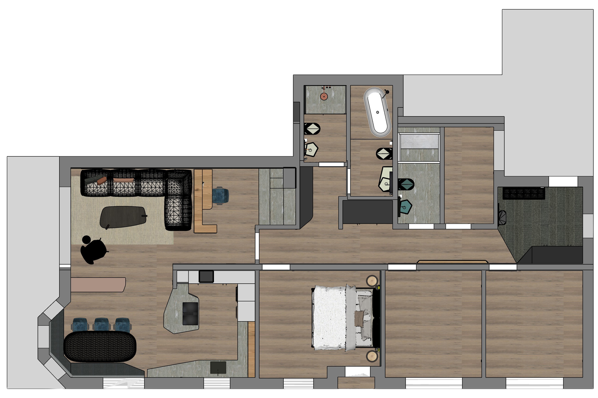 Als konzeptionelles Leitmotiv liessen wir uns von der Struktur der Bienenwabe inspirieren. Sie steht für Ordnung, Wiederholung und Verbundenheit. Dieses Prinzip haben wir abstrahiert und in fliessende Linien sowie subtile Hexagon-Elemente übersetzt, die sich in Möbeln, Winkeln und Details wiederfinden.