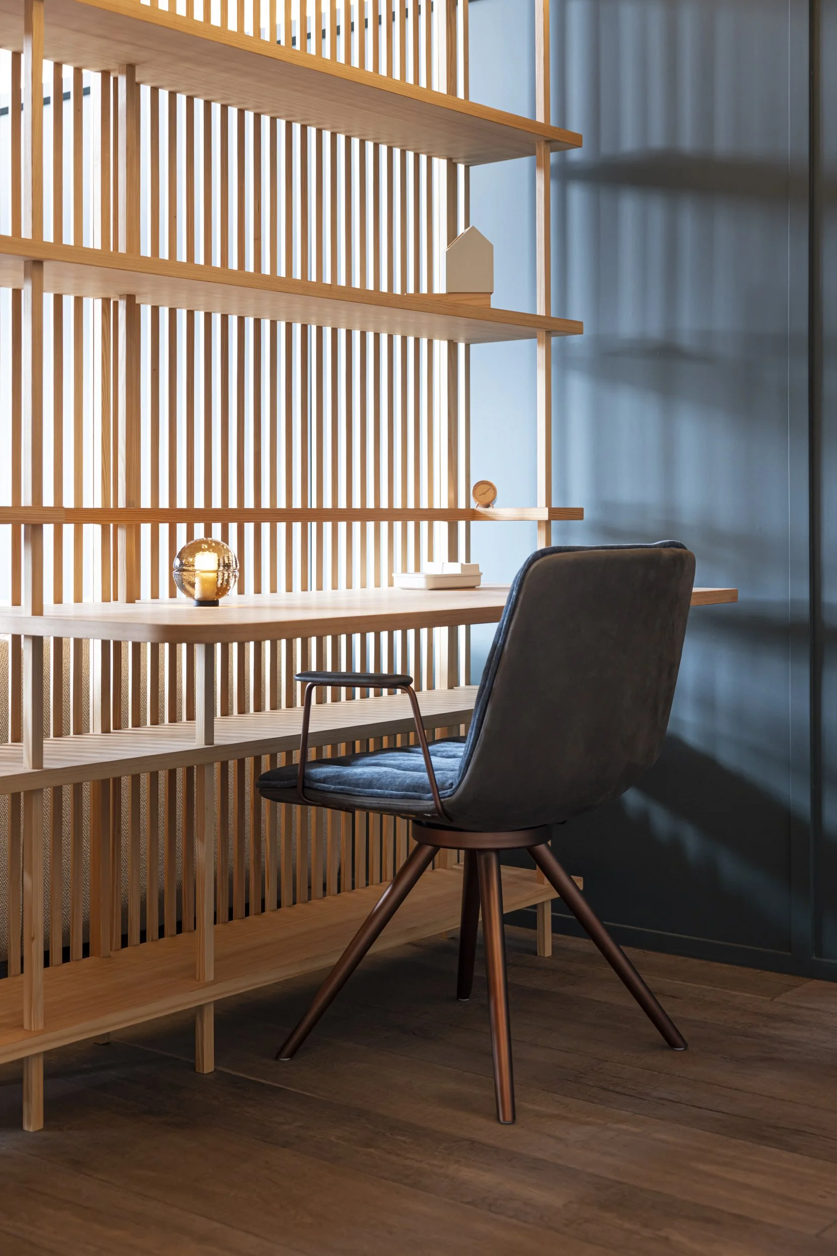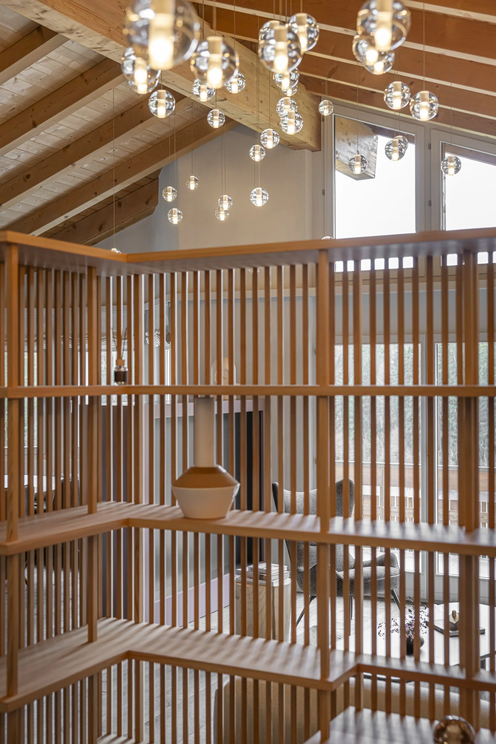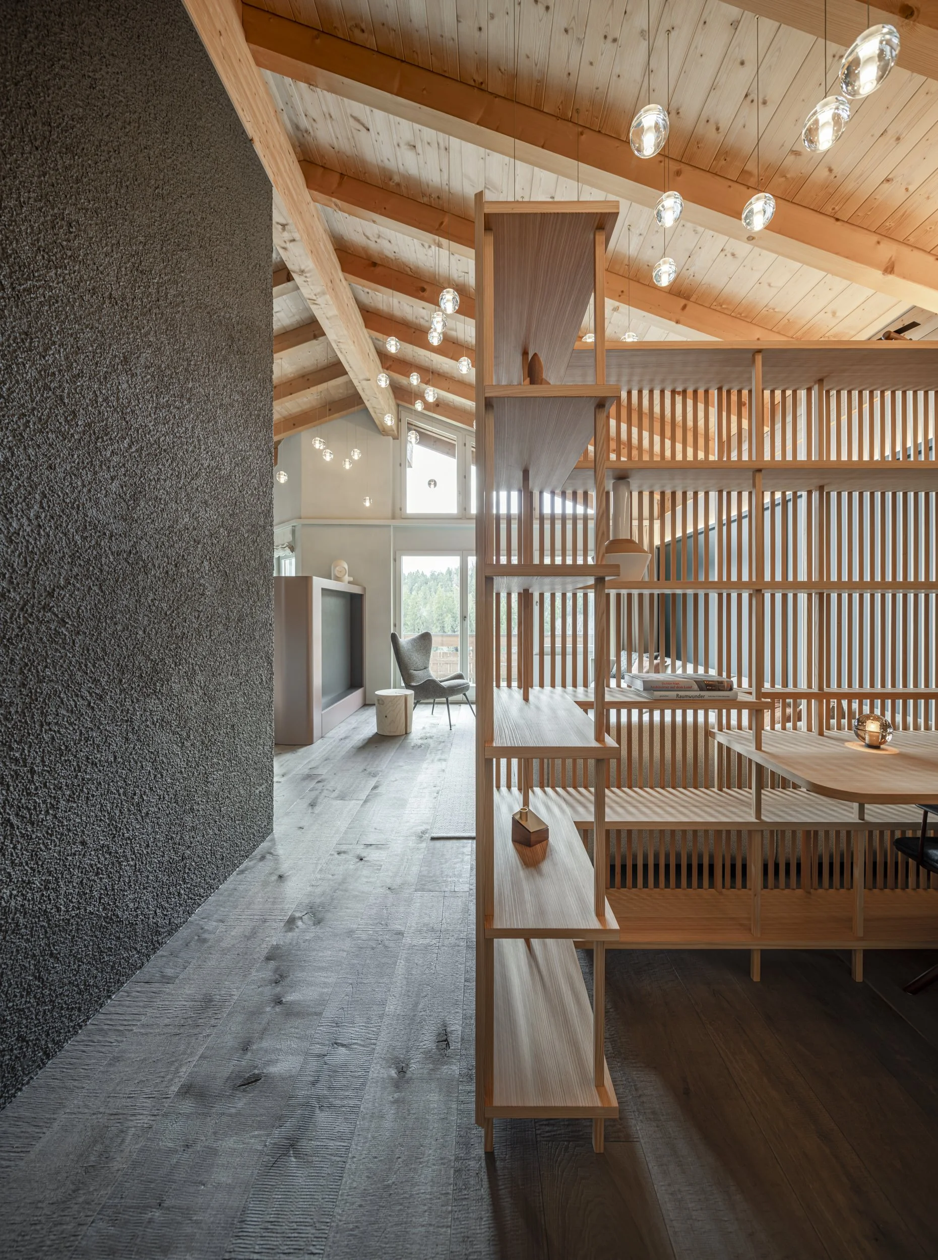 Im Wohnraum kuschelt sich alles um einen Kachelofen aus Valserstein, der die räumliche Mitte übernimmt. Verspielt ergänzt wird er durch kleine Treppen, gedacht für Kinder, die gerne beim Ofen sitzen. Den offenen Grundriss haben wir mit einem Lamellen-Raumteiler aus Lärchenholz behutsam gegliedert. So bleibt er offen, erhält aber eine gemütliche Bürotischnische zum Arbeiten und Lesen, ohne die Gesamtwirkung zu fragmentieren. 44 mundgeblasene Leuchten haben wir bewusst so platziert, dass sie die Höhe strukturieren und vertikale Akzente setzen. Sie wirken wie Eiskristalle über dem Raum.