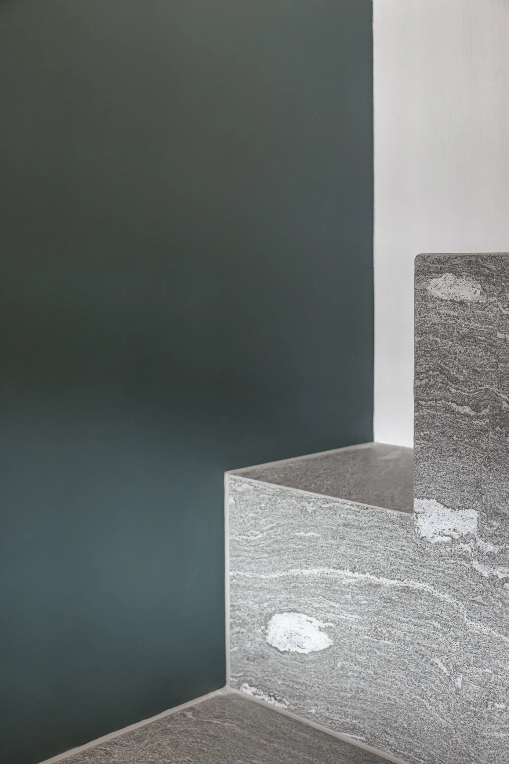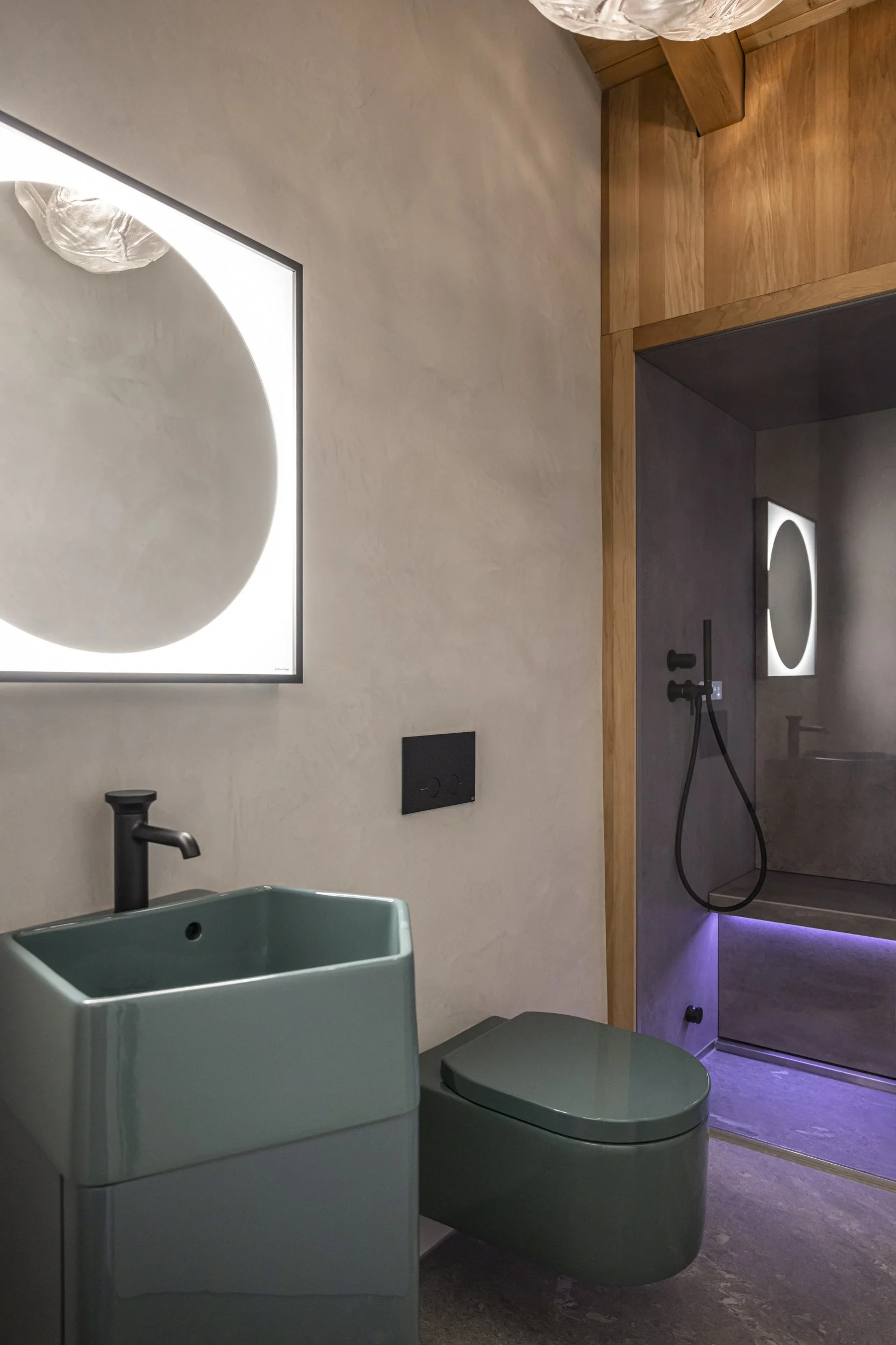 Auch die drei Bäder folgen der klaren Material- und Lichtlogik: Kalkwände, Valserstein, Eiche und zurückhaltende Beleuchtung bilden das Gerüst, verzaubern jedoch mit unterschiedlichen Stimmungen. Das kleinste Bad, das kein Dachfenster hat, wollten wir in eine Wellnessgrotte verwandeln. Dafür integrierten wir eine Dampfdusche bzw. ein Hamam sowie ein Lavabo und ein WC in warmem Grün, ergänzt durch mundgeblasene Glasleuchten von Bocci.