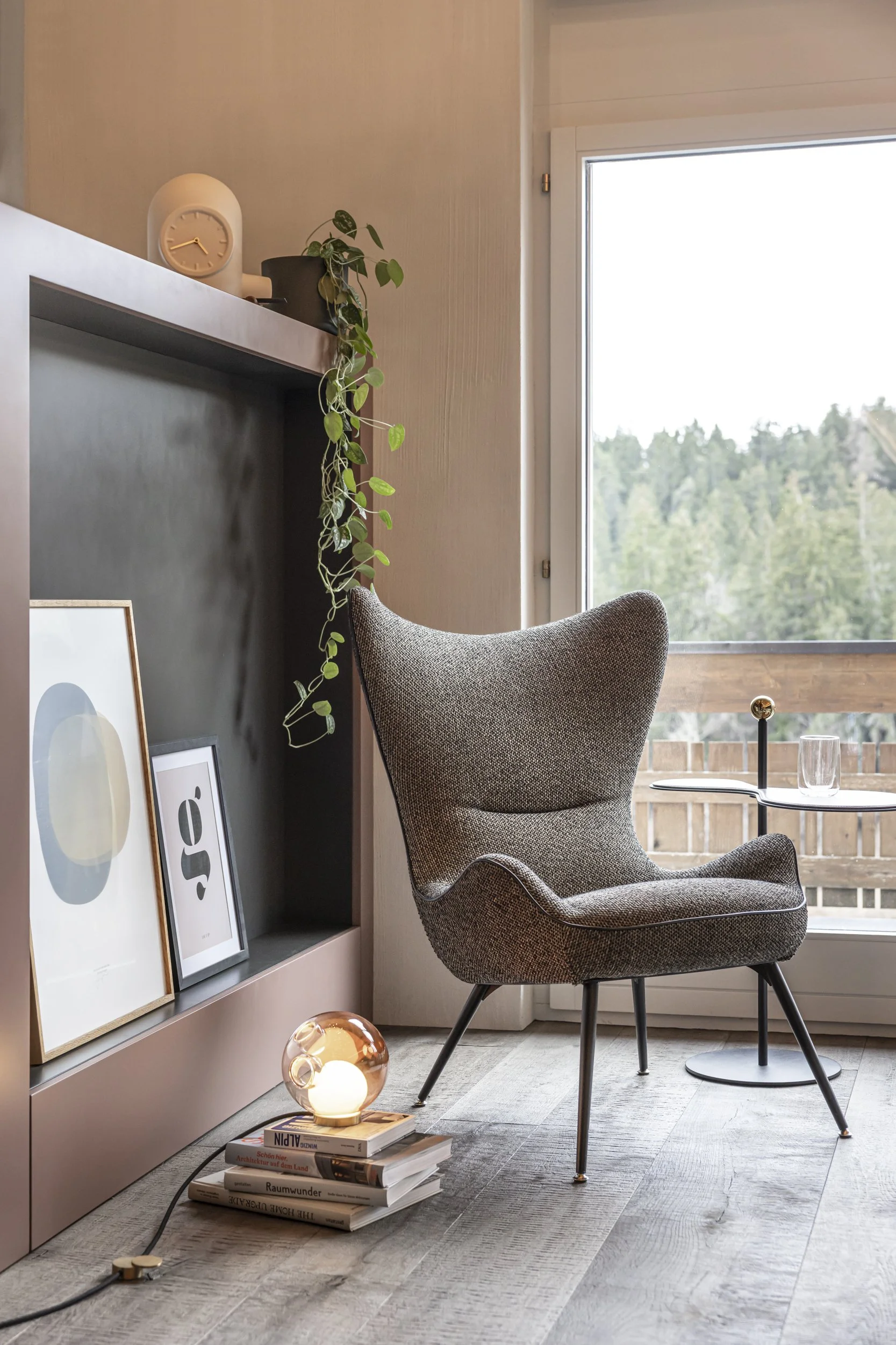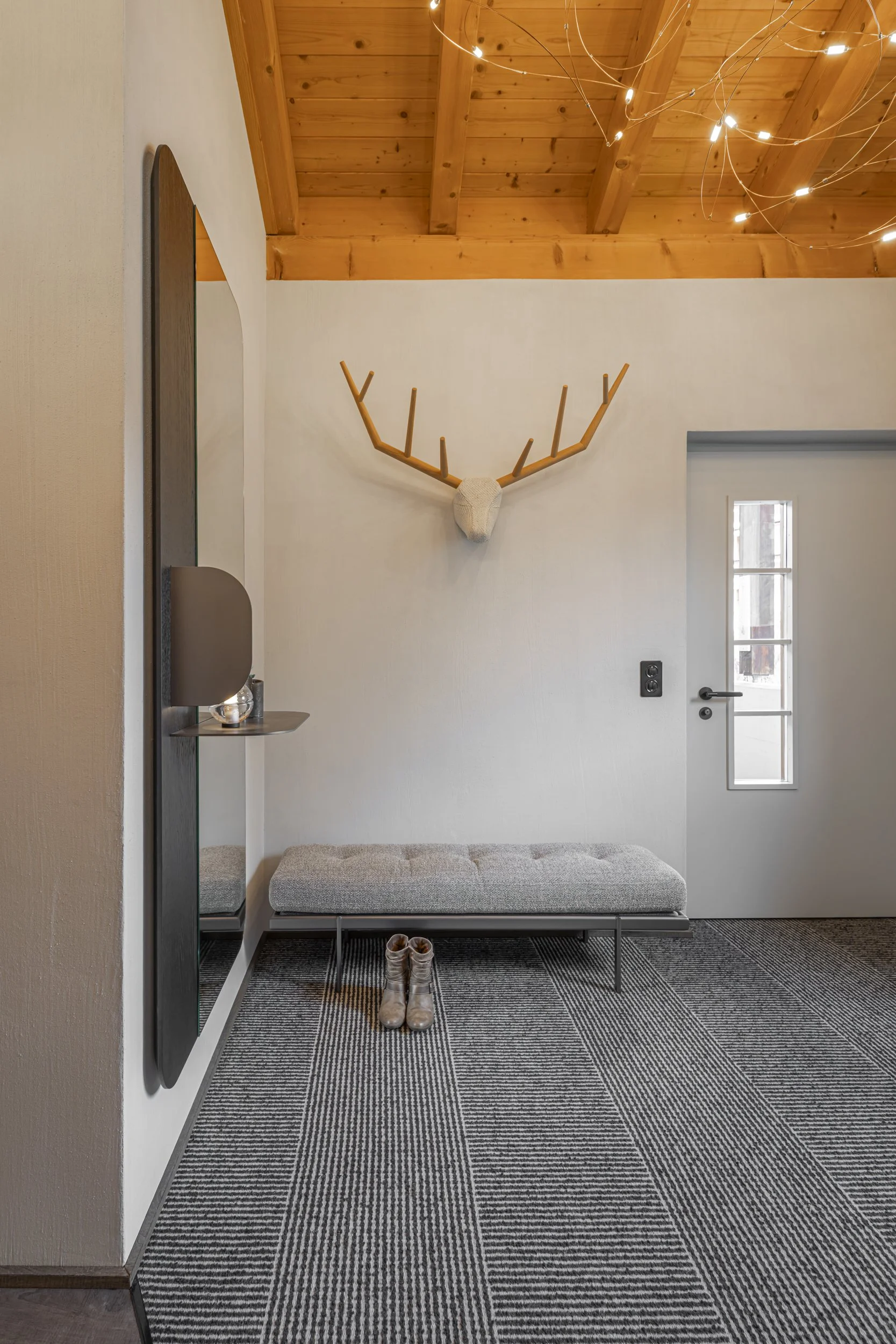 Den neoalpinen Stil wollten wir mittels Täferwänden, Tapeten und einem urchigen Eichenparkettboden mit breiten Dielen ausdrücken. Das Spiel von Stein und Holz, die in dieser Gegend verwurzelt sind, schafft ein Gefühl von Authentizität. Das Konzept folgt dem Motto «Fire and Ice»: Die vielen warmen Elemente wie Holzdielen oder der Kachelofen werden durch transparente Glasleuchten kontrastiert, die wie Eiskristalle wirken. Mit verputzten Kalkwänden, warm-grauen Farbtönen und indirektem Licht wollten wir zudem eine ruhige, zurückhaltende Atmosphäre schaffen, die einzelnen Bereiche mit dem durchgehend verlegten Eichenparkett zu einer räumlichen Einheit verbinden.