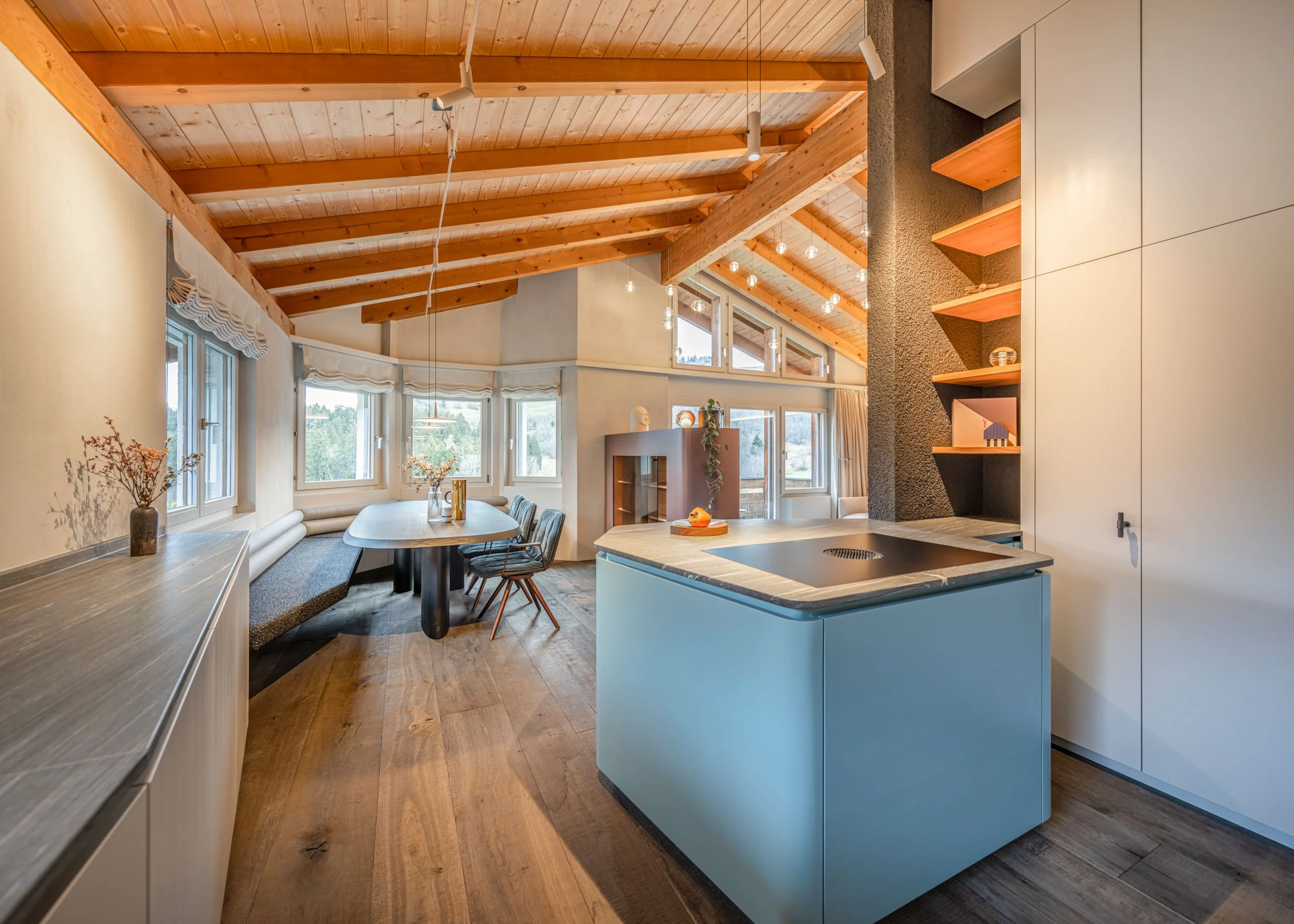 Die massgefertigte Küche mit Kochinsel und Abdeckung aus Valser Quarzit haben wir bis unter die Dachschräge ausgebaut, mit Fronten im Mattlackton «Iceblue» sowie mit Geräten von Bora und V-ZUG. Die Küche wirkt leicht, ihre abgerundeten Elemente und Schrägen lassen den Raum grösser erscheinen. Der offene Essbereich liegt direkt neben der Küche und ist mit einer Eckbank in der schönsten Nische positioniert. Durch die Fenster bietet sich ein Rundumausblick in die Natur und die Berglandschaft – so bildet er den kommunikativen Mittelpunkt der Wohnung.