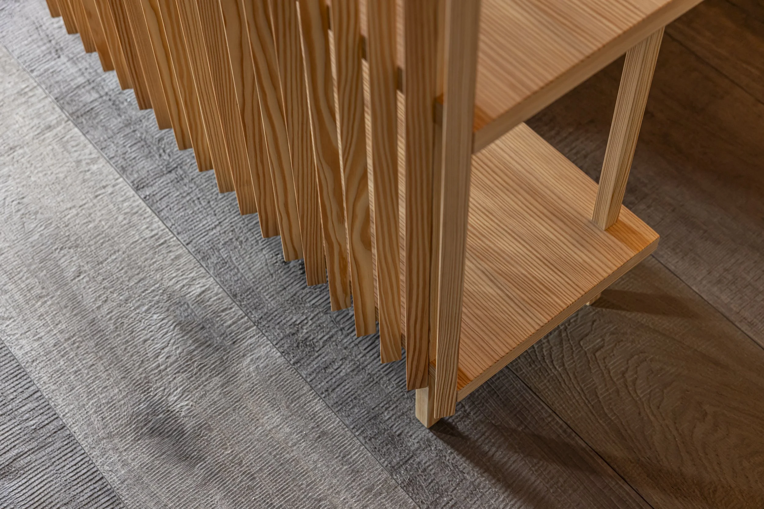 Raumtrenner, der zugleich Platz für eine Arbeitsnische bietet.