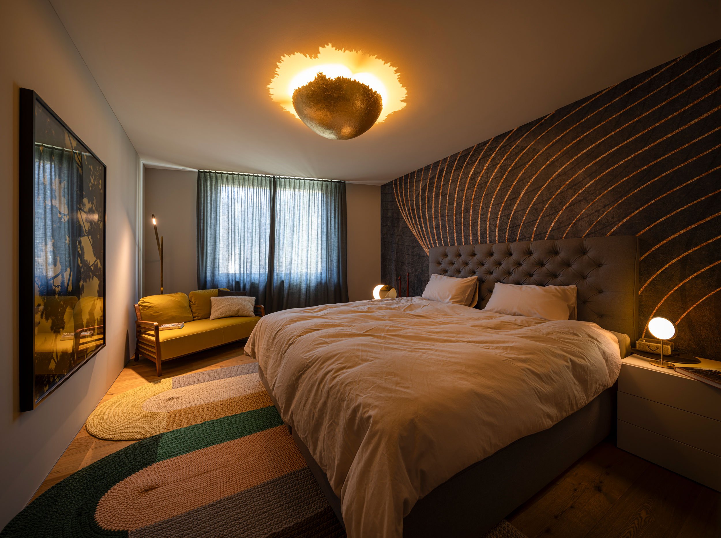 Die privaten Räume wiederum folgen jeweils einer eigenen Stimmung: So haben wir etwa im Master-Schlafzimmer ein bestehendes Nussbaum-Sofa in Senfgelb integriert. Eine dunkelgrüne Tapete mit goldenen Akzenten, eine skulpturale Leuchte von Catellani & Smith und Kunstwerke in Gelbtönen setzen die Highlights.