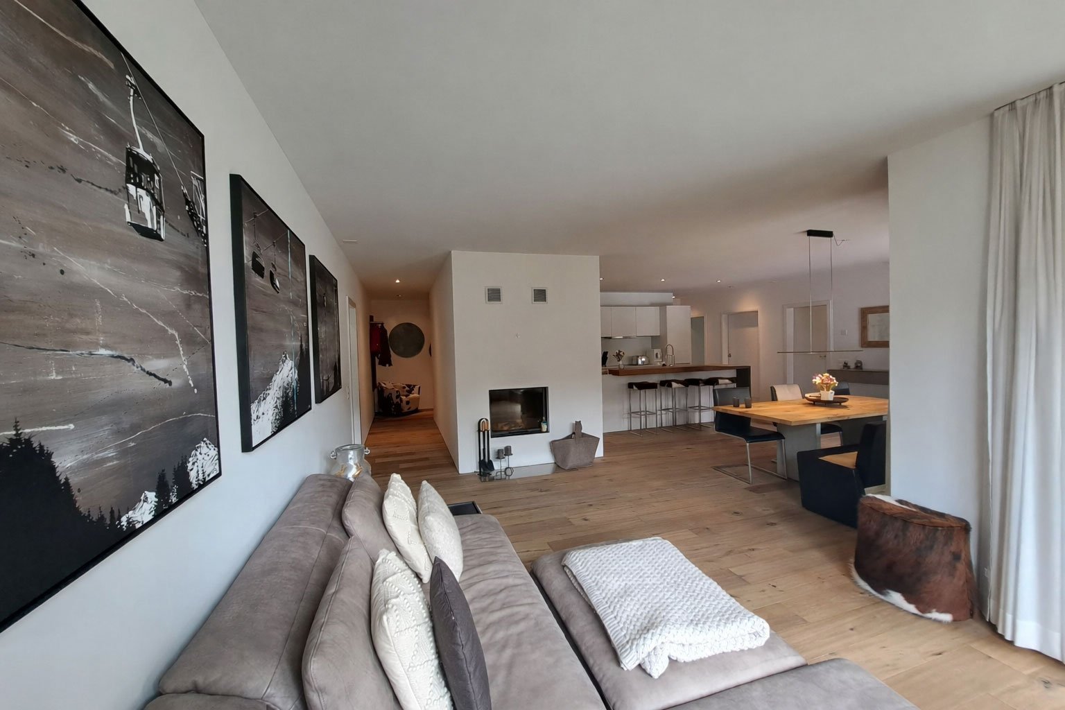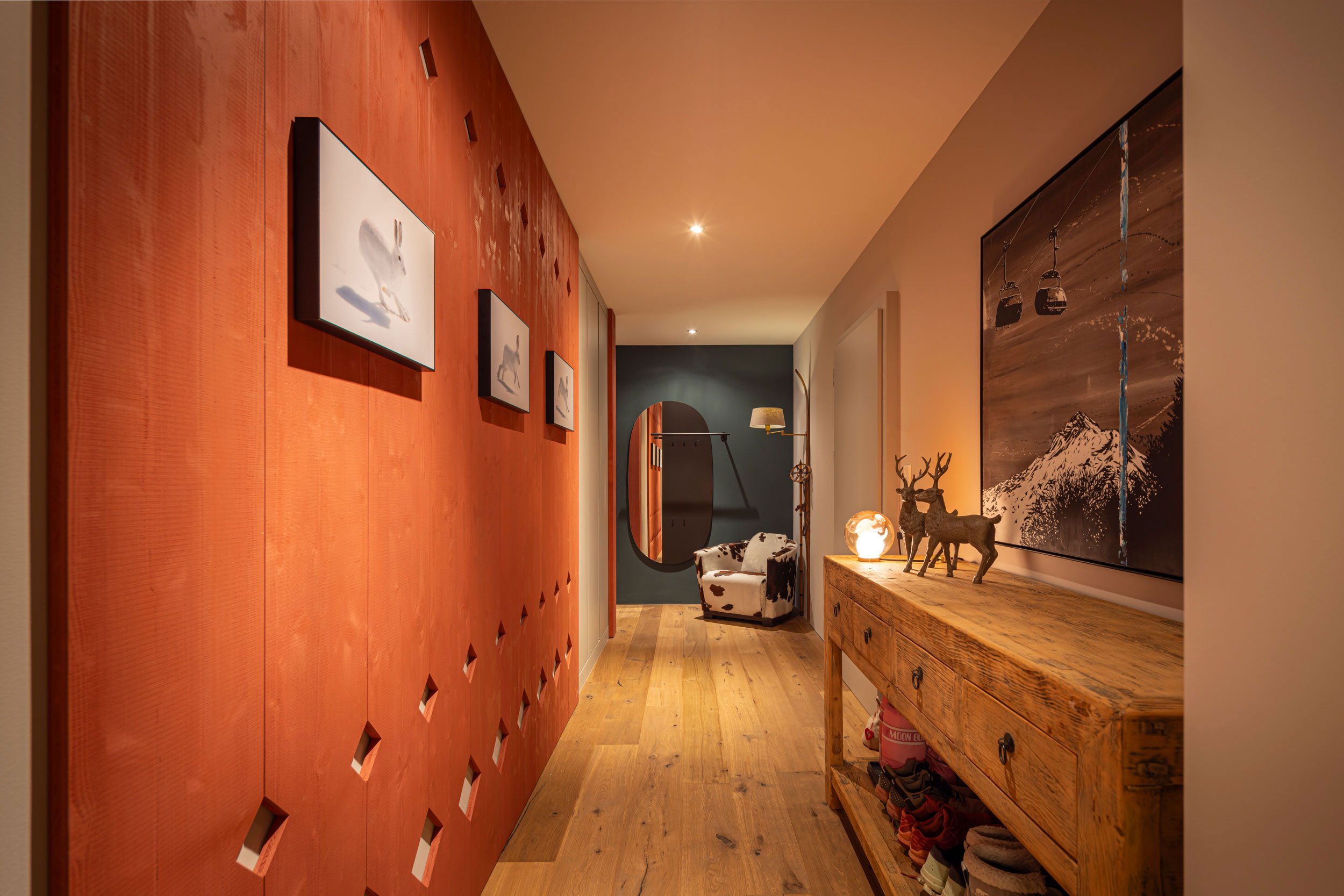 Und so machten wir uns ans Werk: Im Eingangsbereich liessen wir einen Kuhsessel mit Skilampe den Alpenchic aufnehmen, während eine moderne Spiegelgarderobe eine leichte Note ins Spiel bringt. Die kubische Küche in der Raummitte setzt einen kraftvollen Akzent mit Tiefe und Wärme – teilweise verkleideten wir sie mit sägerohem Massivholztäfer, inspiriert von regionalen Stallfassaden, und strichen sie in warmem Rostrot.