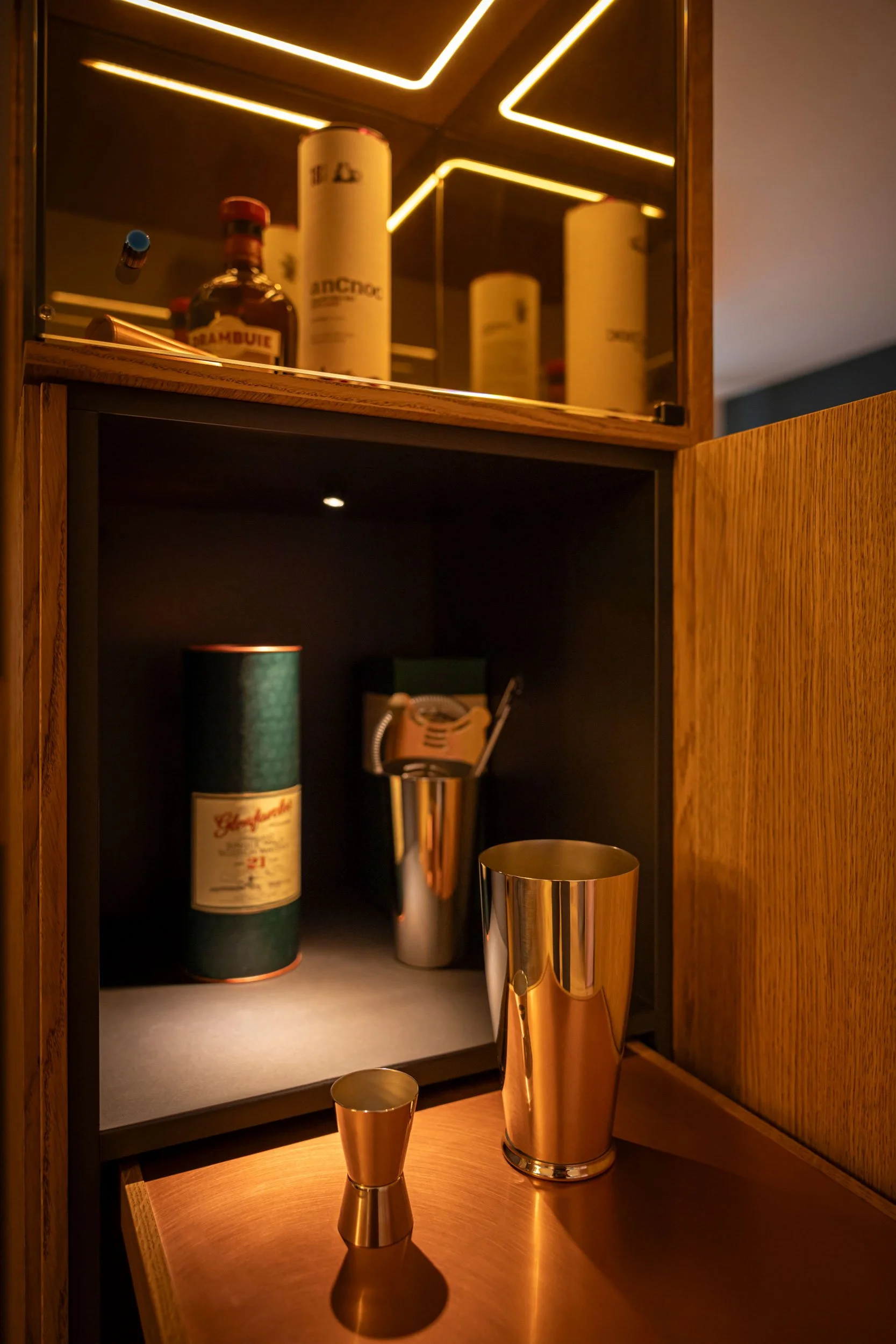 Für den TV-Bereich liessen wir ein Möbel aus Eiche mit Reliefstruktur massfertigen. Spiegel- und Kupferdetails sowie eine dezente Hinterleuchtung geben dem Möbel Tiefe. Ein integriertes Glaskabinett mit ausziehbarem Tisch bietet Platz für eine kleine Bar, die Rückseite zusätzlichen Stauraum für Geschirr und Gläser.