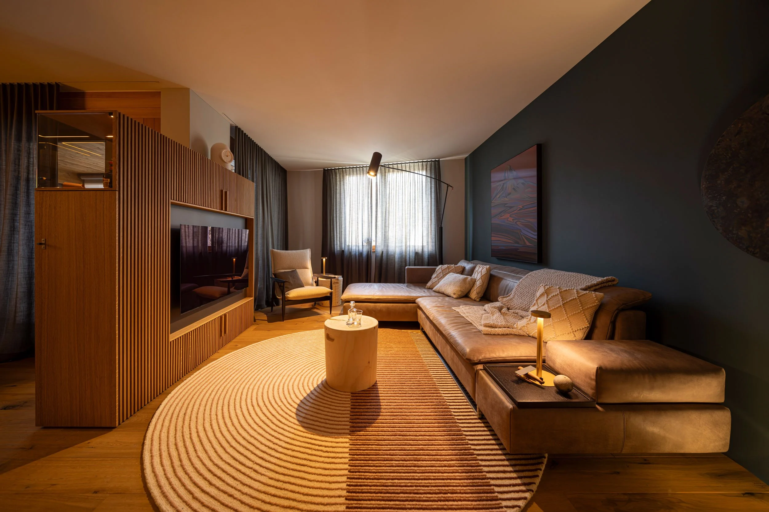 Im Wohnbereich entschieden wir uns für eine dunkle, warme Grünnuance, die an der Rückwand für Ruhe und Balance sorgt. Das Rostrot des Täfers setzt sich in einer gebürsteten Kupferverkleidung fort, die den Kamin ummantelt und ihn so zum zentralen Blickfang macht. Ein runder Teppich in soften Rottönen verbindet die Elemente und schafft Geborgenheit. Holzstumpf-Tische und ein neonfarbenes Kunstwerk mit Bergmotiv zitieren das Alpine auf moderne, überraschende Weise.